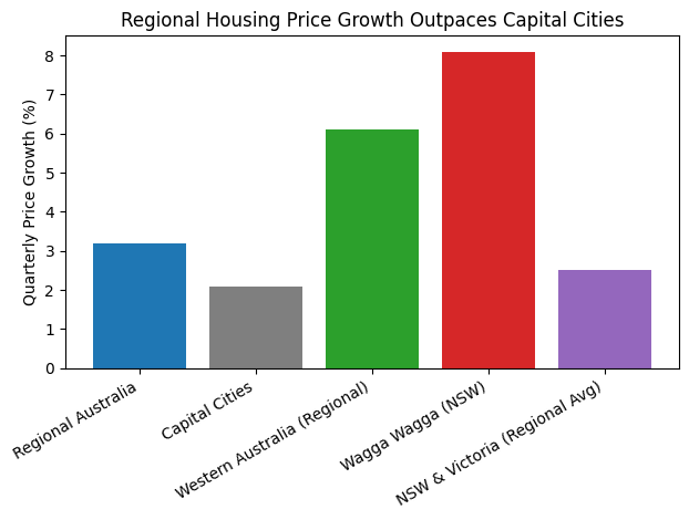 Recent data show regional home prices are outpacing the capitals, driven by buyers chasing affordability and lifestyle. Dwelling values in regional Australia jumped about 3.2% in the three months to January, versus just 2.1% across combined capital cities. Growth is broad-based – Western Australia led with +6.1% (the largest of any state), and inland Wagga Wagga surged ~8.1% in that quarter. By contrast, NSW and Victoria saw much slower gains (around 2.5%), and even a few small regional centres recorded slight declines.