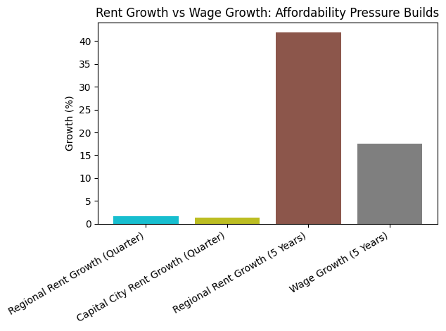 Rents are rising fast too, adding pressure on budgets. Regional rents grew 1.6% in the latest quarter (slightly above 1.4% in cities). Over the past 5 years, rents in the regions have shot up ~41.9%, far ahead of wage growth (~17.5%). In practical terms, renting is becoming less affordable for many households. For borrowers, higher rents and living costs can crimp borrowing power and serviceability, especially if banks start stress-testing on rental expenses.