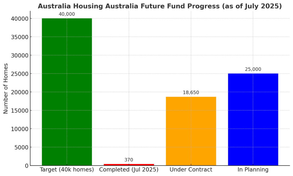 Australia’s housing agenda remains ambitious but outpaced by reality. The government’s $10 billion Housing Australia Future Fund was meant to support 40,000 new social and affordable homes over the next 4–5 years. Yet progress has been slow: by July 2025 only about 370 homes were completed under this policy. Housing Australia reports that about 18,650 homes are under contract (with $14.0 b committed) toward that 40k goal, but that still leaves a long way to go. Minister Mark Butler notes roughly 25,000 homes are in various planning stages, but Senate delays set projects back by about a year. In short, political holdups have pushed out the build schedule.