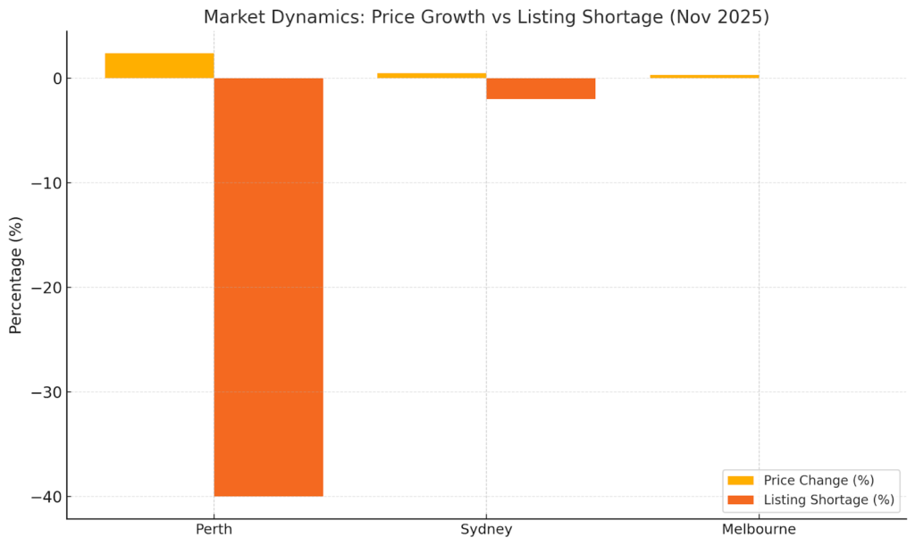 Many suburbs in Perth and other mid-sized markets are seeing steep price rises as listings fall and buyers compete for homes. Perth’s listings were about 40% below average, helping push its median house price up roughly $21,000 in November. By comparison, Sydney’s listings are barely below long-term norms (around 2% under average), so growth there is more muted. Low auction clearance rates also signal cooling momentum – clearance rates have slipped below decade averages in recent weeks.