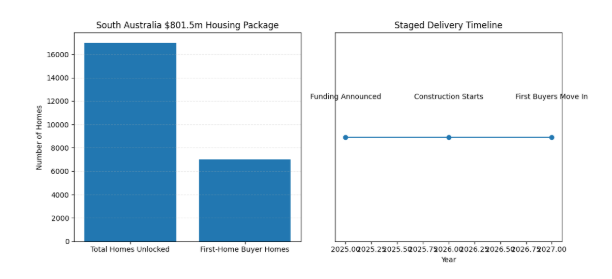 The Albanese and Malinauskas governments have announced an $801.5 million package to unlock about 17,000 new homes in South Australia – roughly 7,000 of which are reserved for first-home buyers. The funding is aimed at upgrading “last-mile” infrastructure (roads, water, sewerage, power) so that new estates can be fast-tracked. In practice, this means developments in Adelaide’s growth corridors and urban renewal zones will be shovel-ready much sooner. Construction is slated to begin in 2026/27, with first buyers moving in around 2027/28. In short, this is a long-term supply boost – but the extra homes will arrive in stages over the next few years, not all at once.
